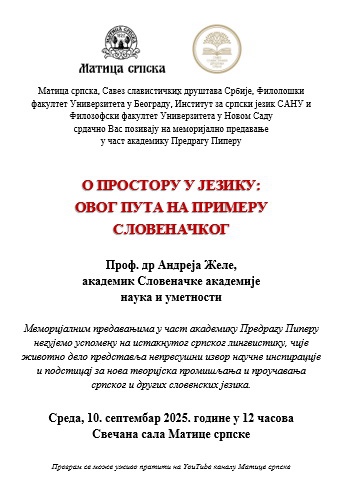 Меморијално предавање у част академику Предрагу ПиперуВреме10. септембар 2025. 12:00ПредавачПроф. др Андреја ЖелеМестоСвечана сала Матице српске Слике