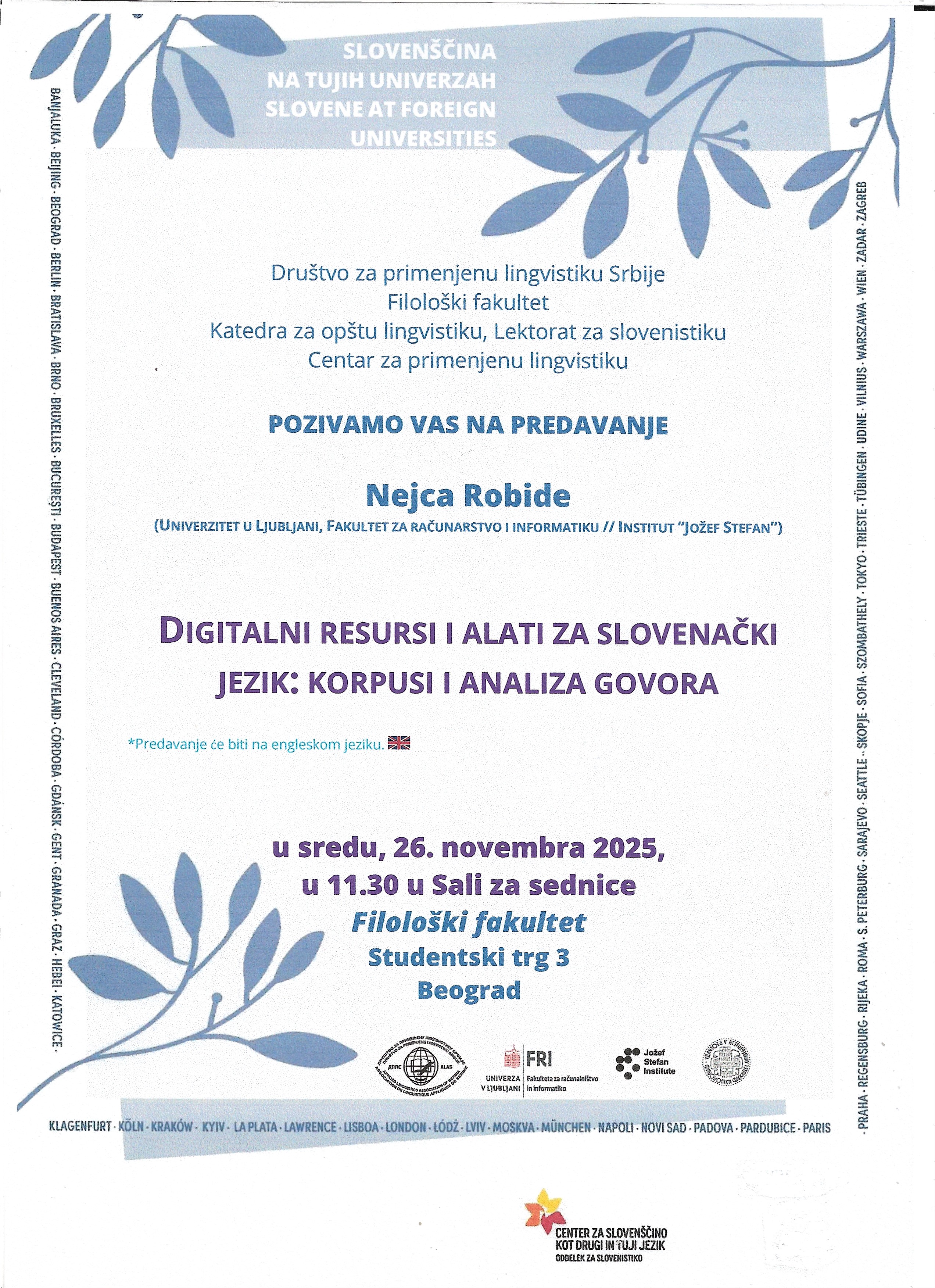Предавање ће представити најновија достигнућа у језичким технологијама за словеначки језик, с фокусом на рад Центра за језичке ресурсе и технологије (CJVT) Универзитета у Љубљани, дајући преглед кључних језичких ресурса и алата, међу којима су референтни корпус Gigafida 2.0 (Krek et al, 2019), говорни корпус GOS 2.1 (Verdonik et al., 2023), лексичка база Sloleks (Čibej et al., 2022), као и приказујући тренутно активне пројекте попут MEZZANINE и PoVeJMo. Поред тога, предавање ће приказати како квантитативне фонетске студије омогућавају обимне акустичке анализе које би ручним поступцима биле неизводљиве. Такође, биће представљен развој рачунарског модела за препознавање примарног акцента у словеначком језику, који би могао унапредити аутоматску анотацију говорних ресурса и допринети ажурирању Дигиталне речничке базе словеначког језика (DDDS) поузданим прозодијским информацијама.