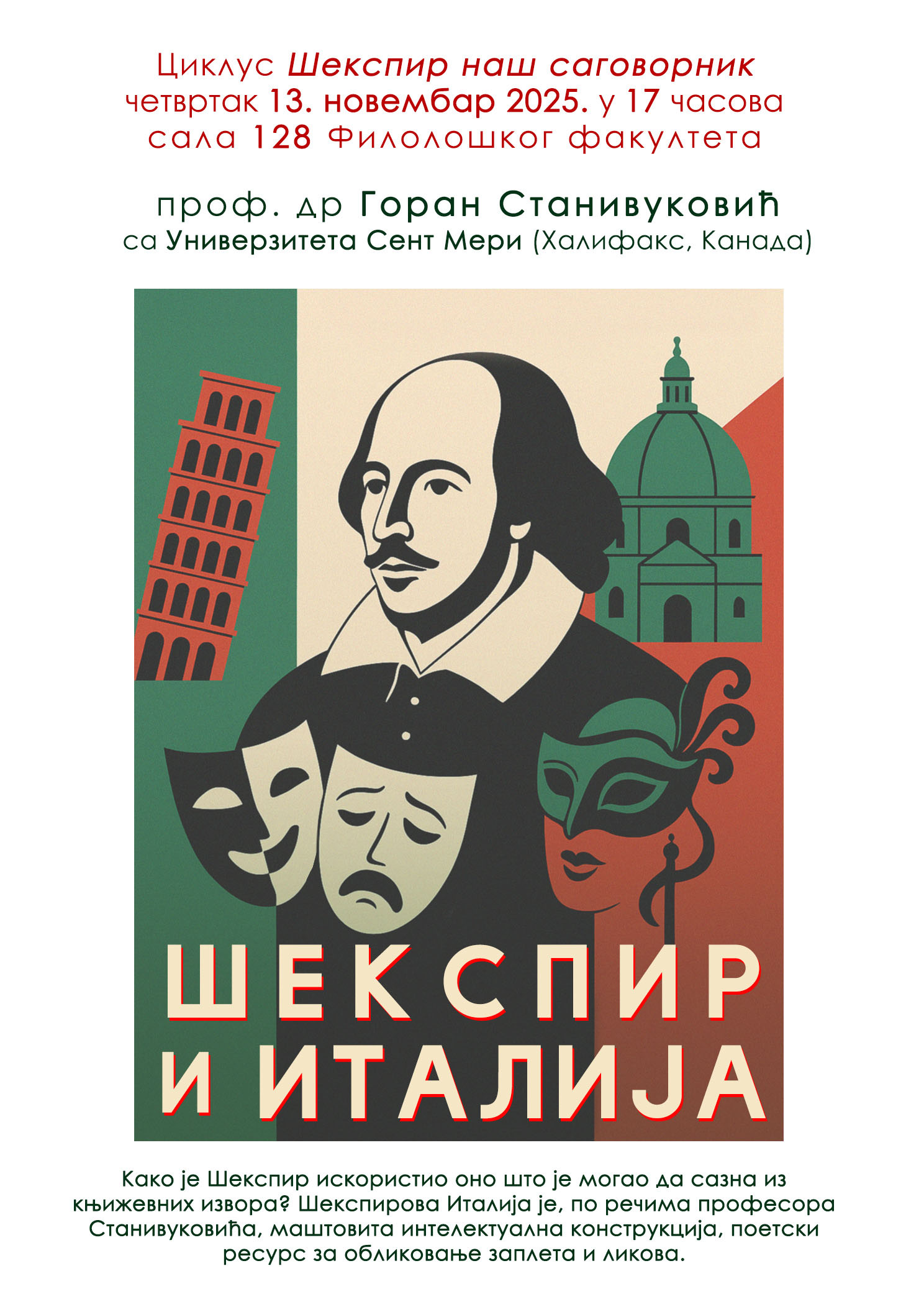 Предавање Шекспир и Италија - четвртак 13. новембар у 17 часова у сали 12810. новембар 2025. 12:34:36Општа књижевност и теорија књижевности